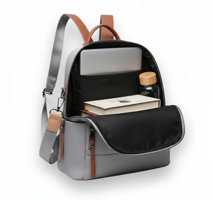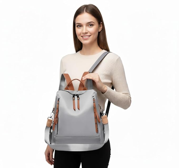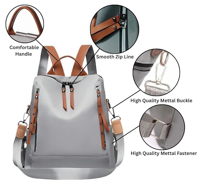 - DESIGN FEATURES: Sleek grey Oxford fabric backpack with elegant gold-tone zippers and convenient dual compartment design